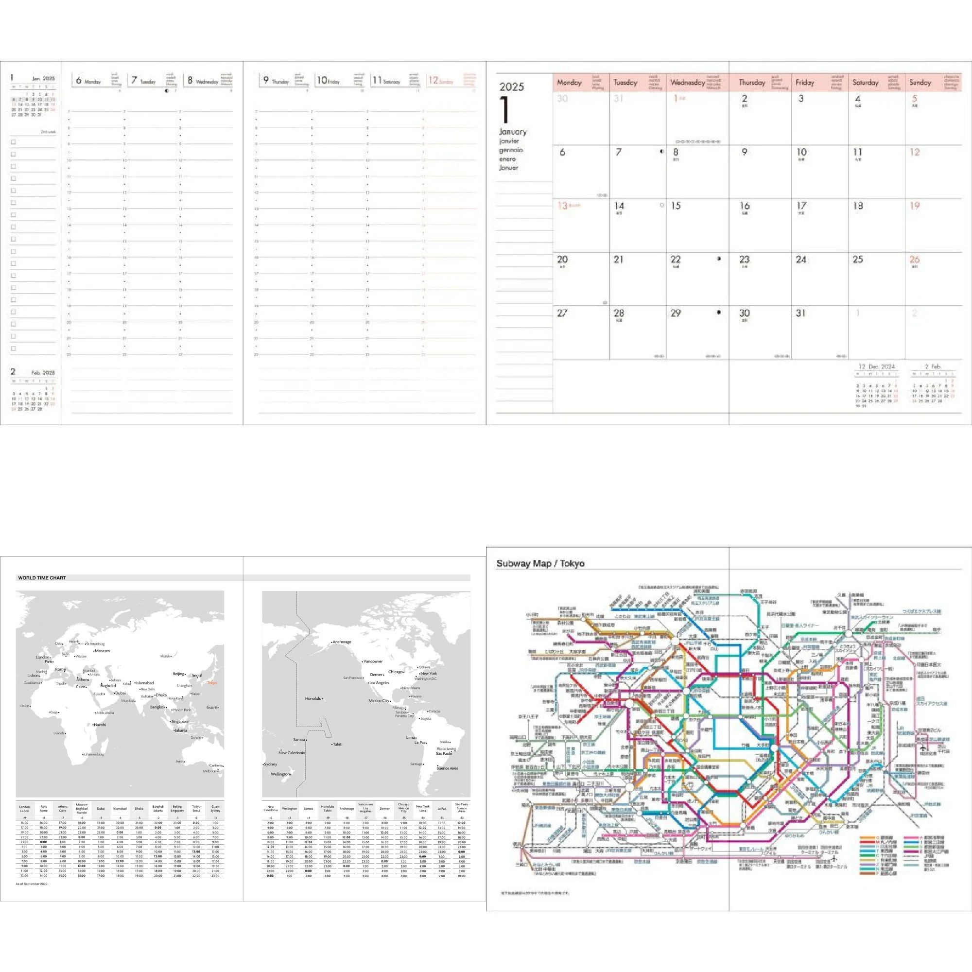 Secciones extra: datos personales, tabla de husos horarios (reconocida por viajes o trabajo internacional) y, en algunas versiones, mapas de metro y frases útiles en varios idiomas