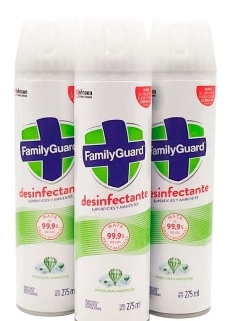 Family Guard® Aerosol Desinfecta* superficies no porosas eliminando el 99.9% de hongos, virus y bacterias. Elimina Virus y previene la formación de moho** y hongos.