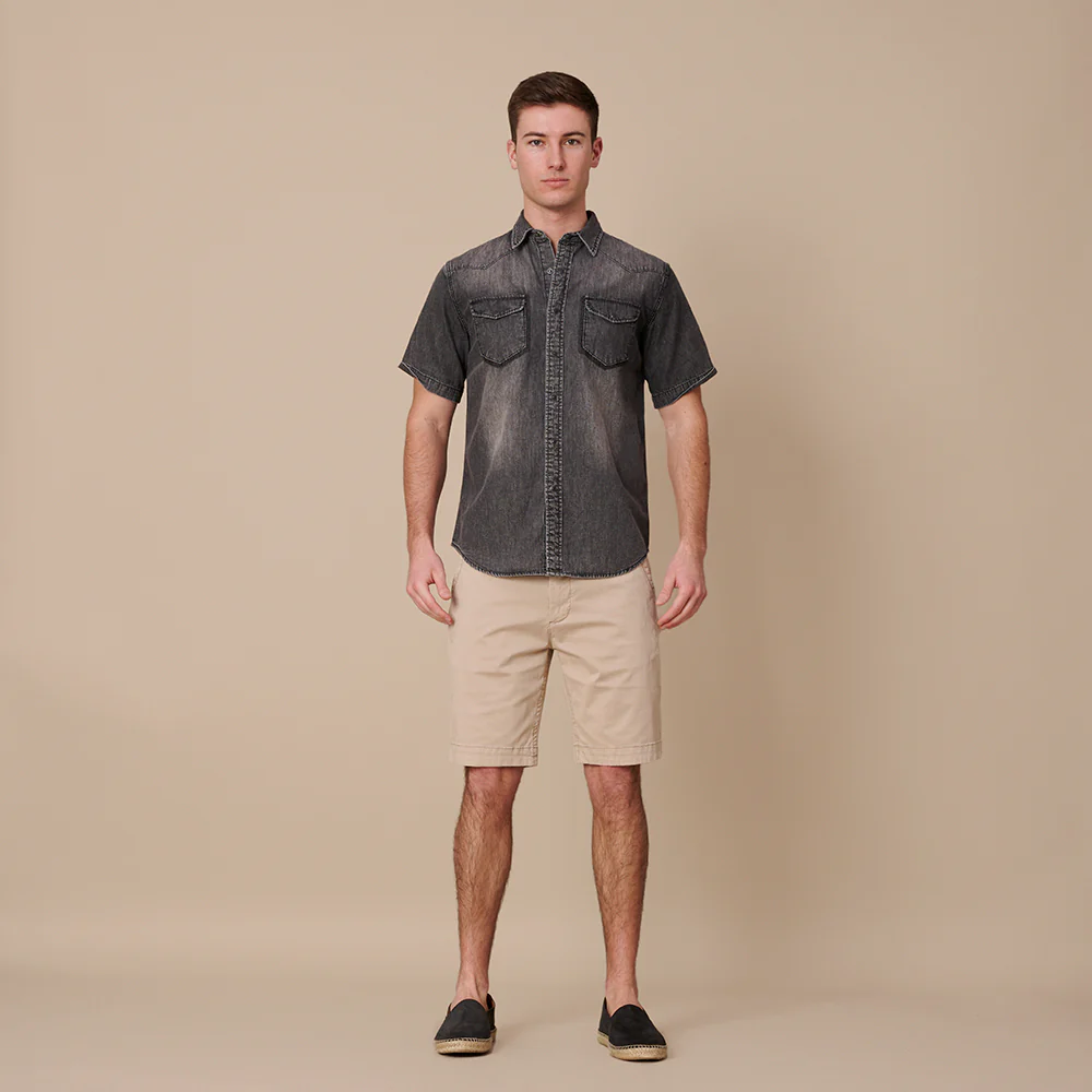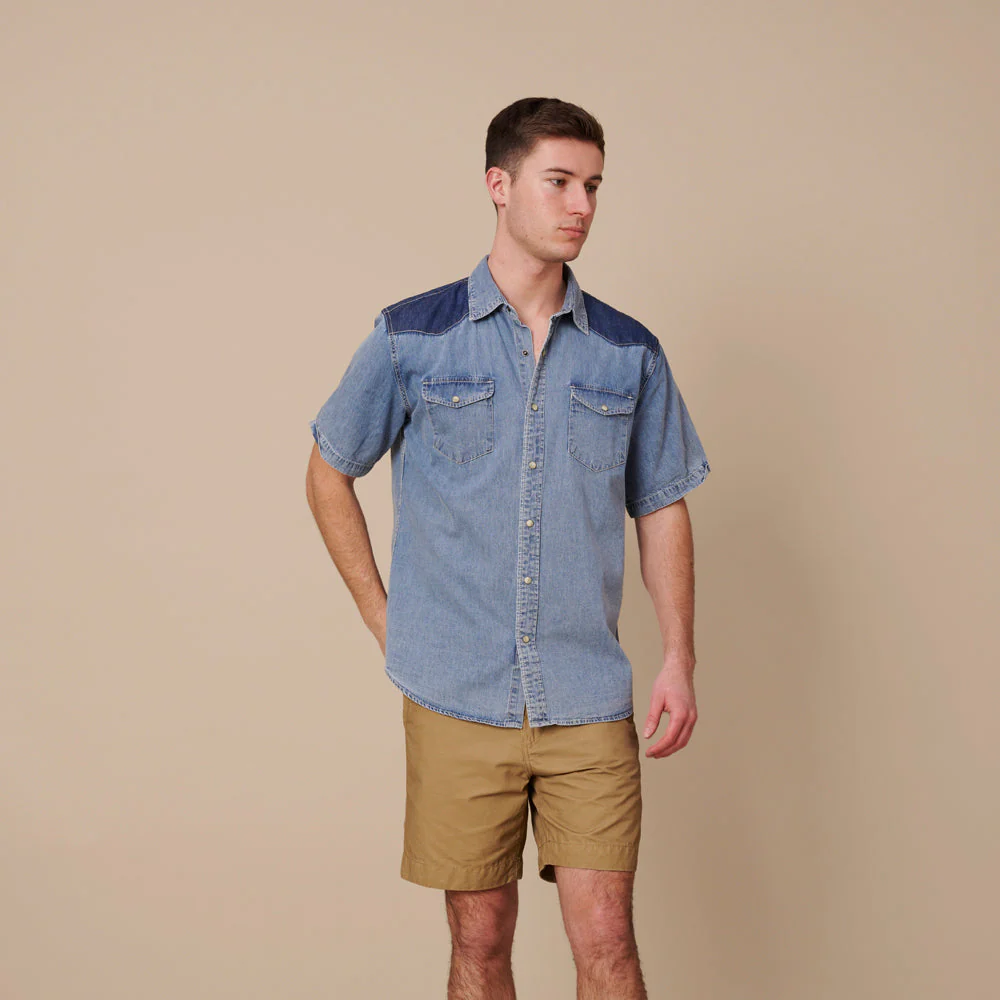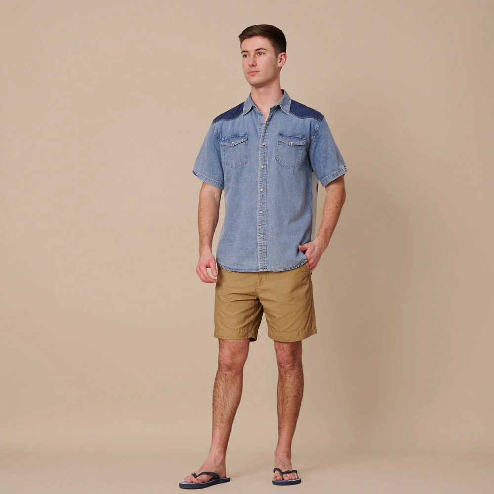 Cuello en Punta Semi Abierto. Manga Corte. Calce Ligermente Slim. Dos Bolsillos en Pecho. Tela Denim 脥ndigo. Costuras Reforzadas de Puntada Corta. Botones Broche. Lavada para Extra Suavidad