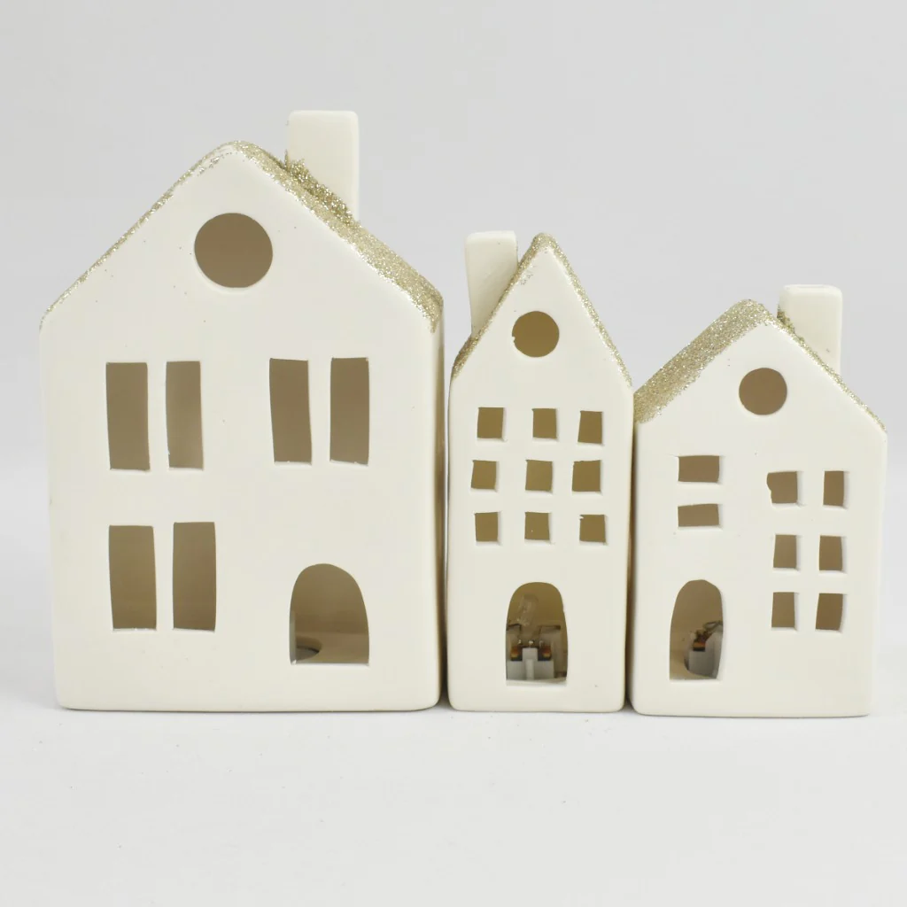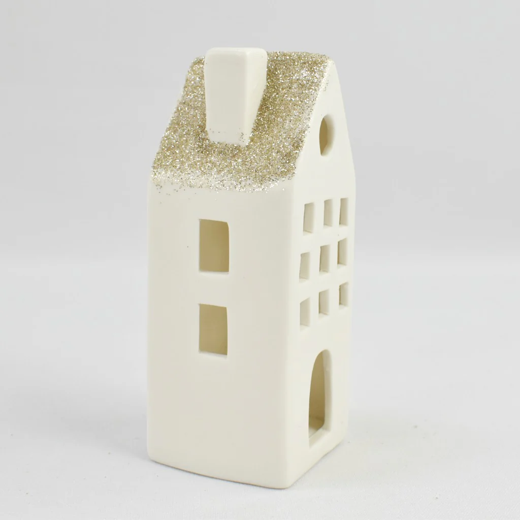 Casa de cerámica con Led incorporada y tejado con glitter dorado de 13x5x5 cm. Perfecta para decorar nuestra casa y/o crear nuestro poblado navideño.
