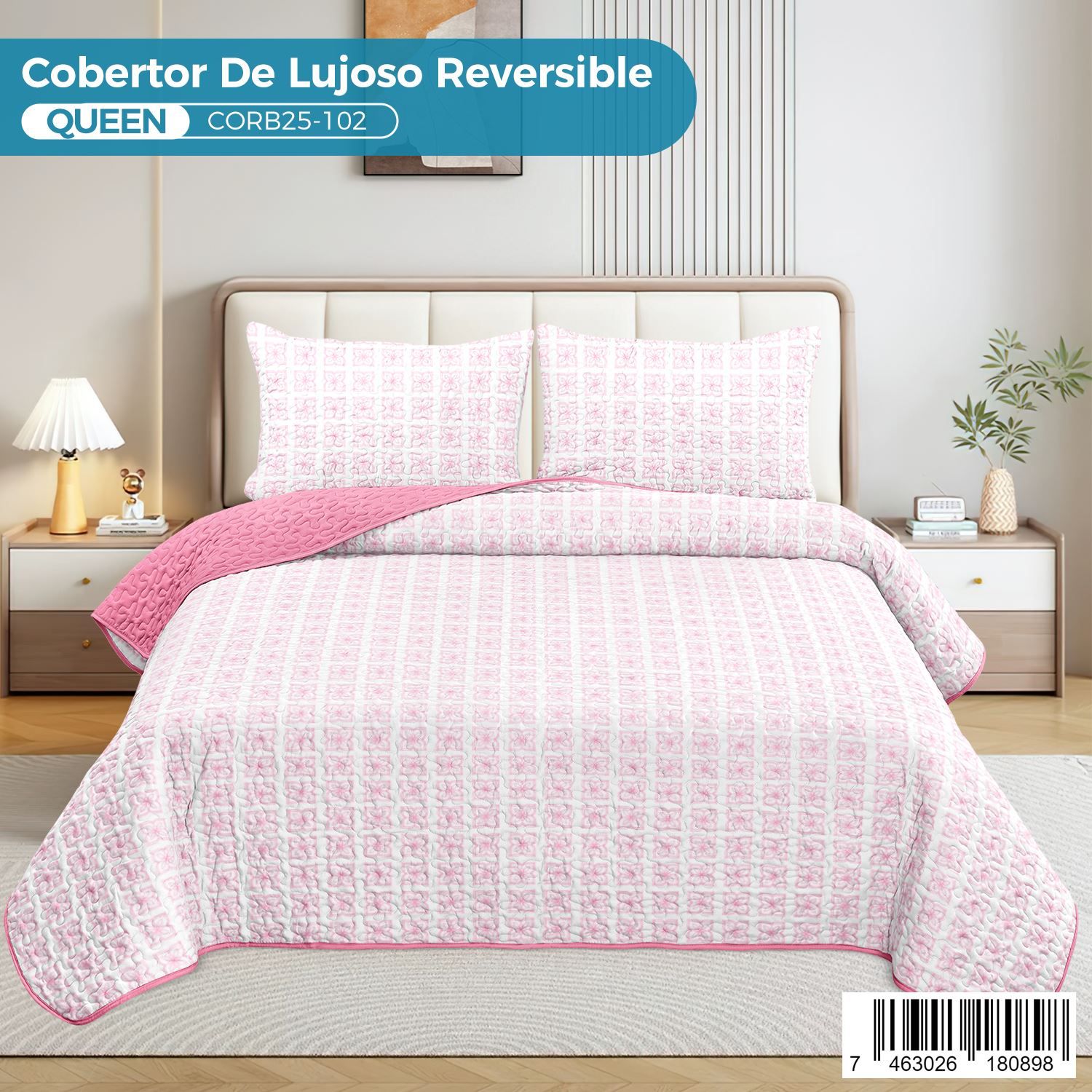 Este cobertor reversible es perfecto para darle un toque elegante y fresco a tu dormitorio. Incluye fundas de almohada a juego y ofrece versatilidad y estilo para diferentes ambientes. Su diseño reversible combina una cara con estampado y la otra en color liso, permitiéndote variar la decoración según tu preferencia.