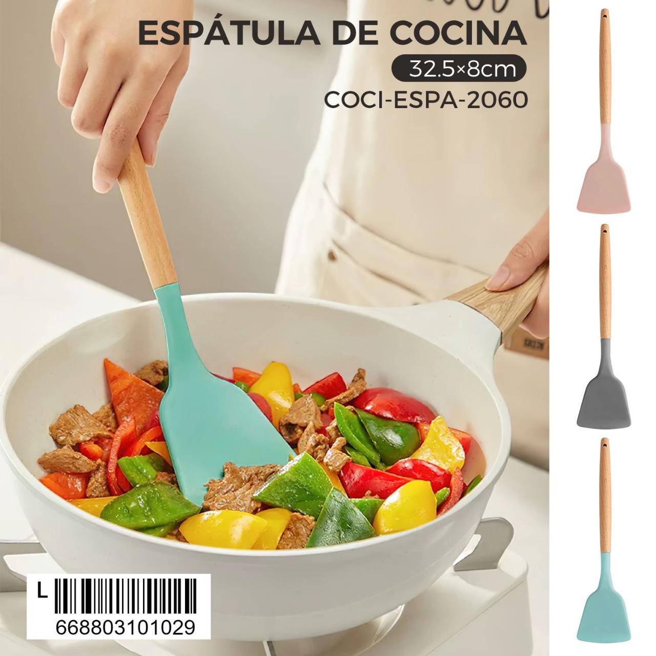 Espátula de cocina con mango de madera y cabeza de silicona, perfecta para mezclar, revolver y servir alimentos sin rayar tus sartenes o utensilios antiadherentes. Su diseño ergonómico y materiales resistentes la hacen ideal para uso diario en la cocina.