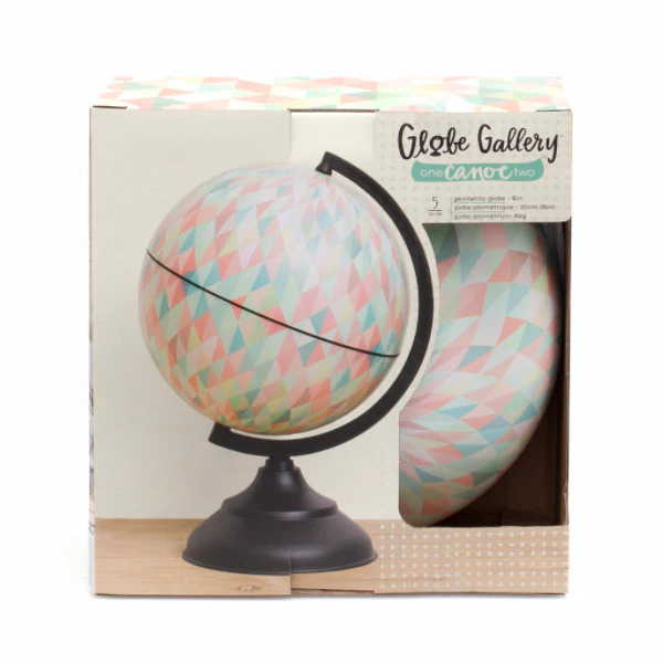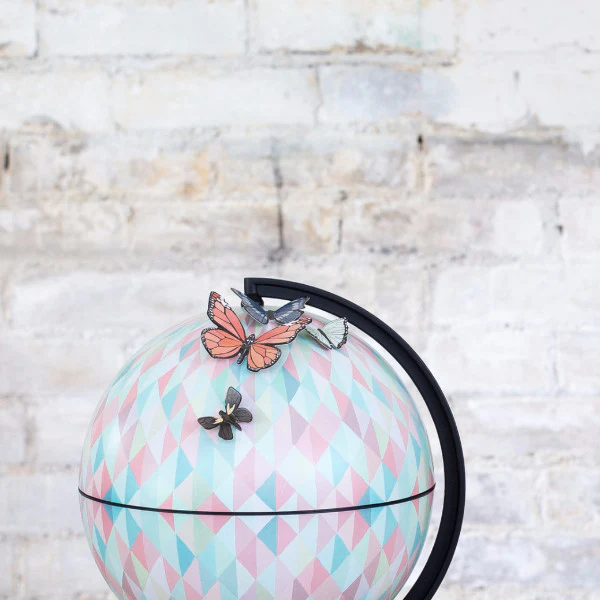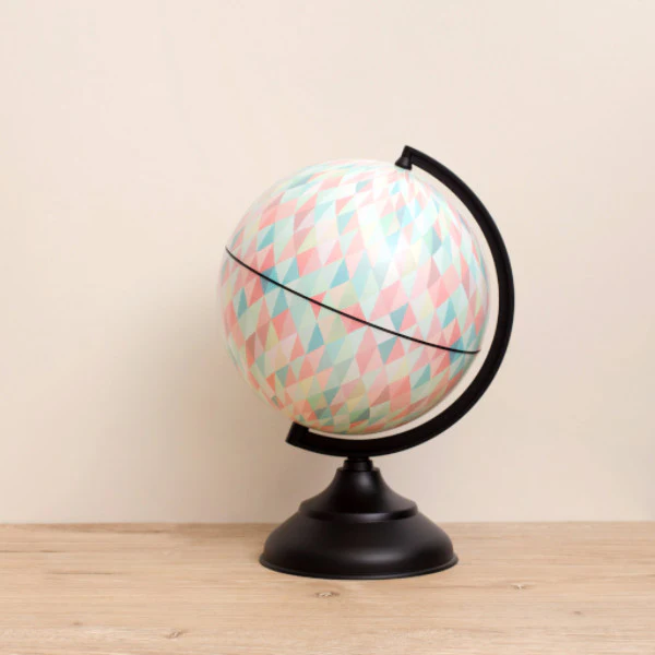 Globo Terraqueo con estampado geométrico en colores suaves. Pie color bronce. 20,32 cm de altura.