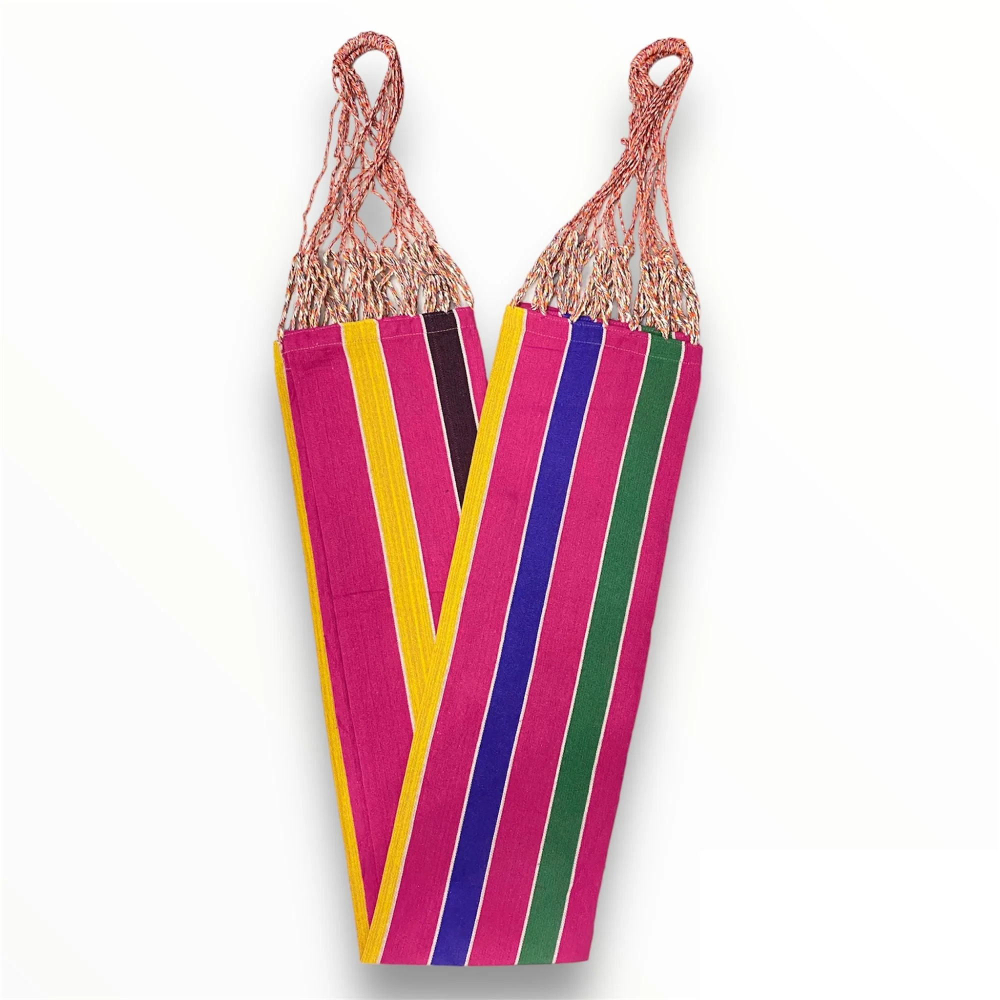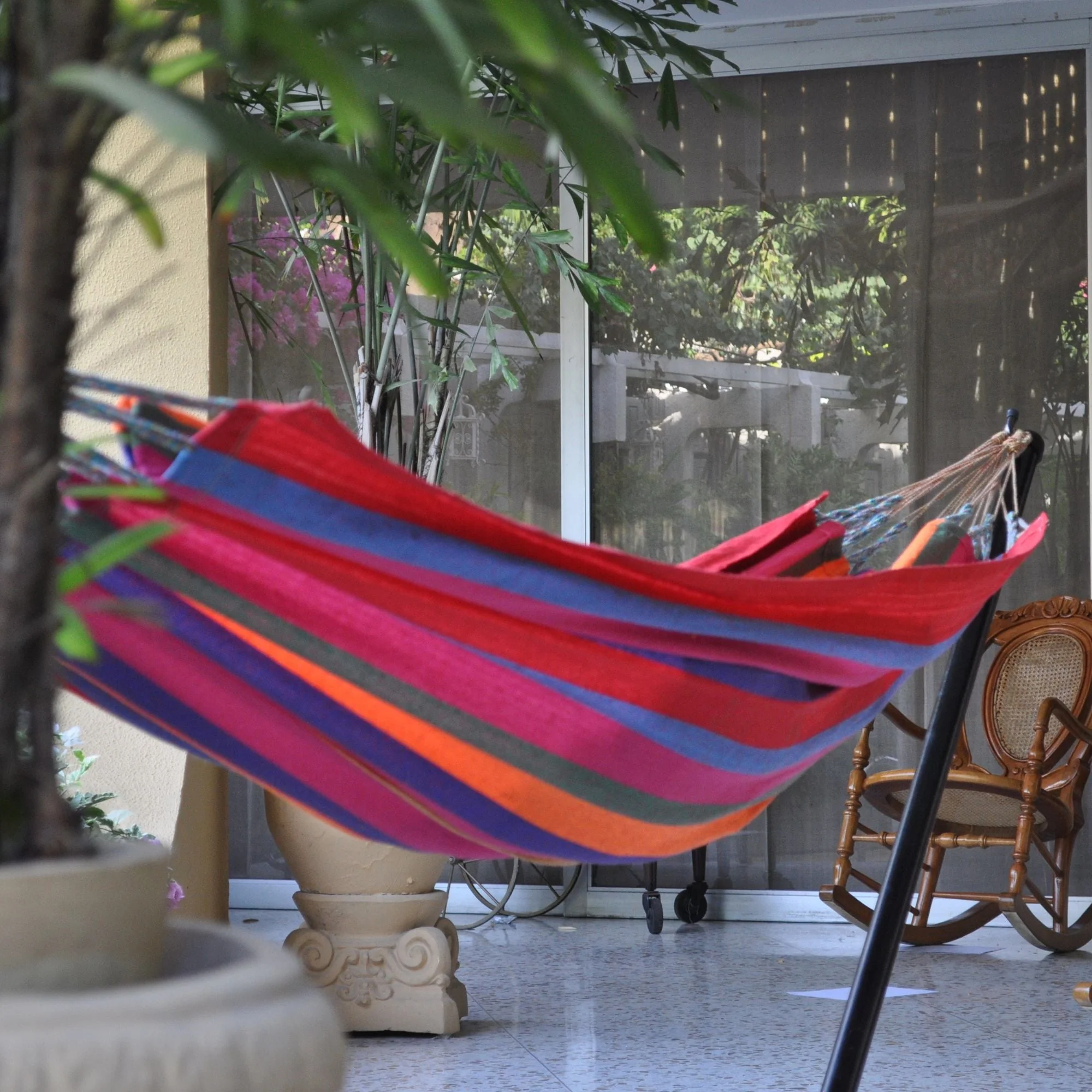 Su suavidad acompa帽ada de vivos colores hacen de esta hamaca sea la mejor opci贸n para descansar, tomarse una siesta o leer.