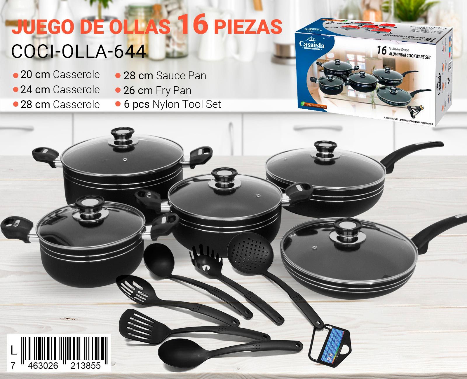 Ideal para equipar tu cocina por completo, este juego de ollas y sartenes de 16 piezas ofrece una solución versátil para todas tus necesidades culinarias. Incluye una variedad de tamaños de cacerolas y sartenes con revestimiento antiadherente, además de un set de utensilios de nylon, asegurando una cocción eficiente y una fácil limpieza.