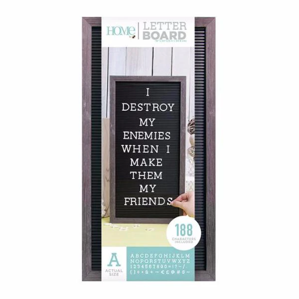 Panel para letras o letterboard de color negro con marco gris que incluye 188 caracteres de letras y números. Tamaño 25 x 50 cm.