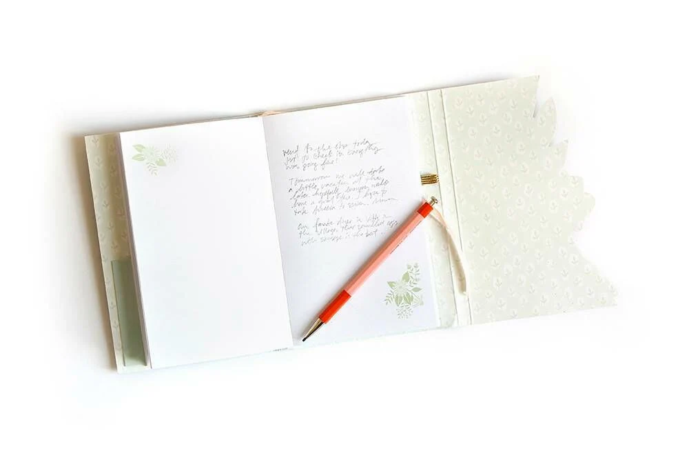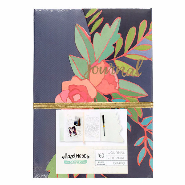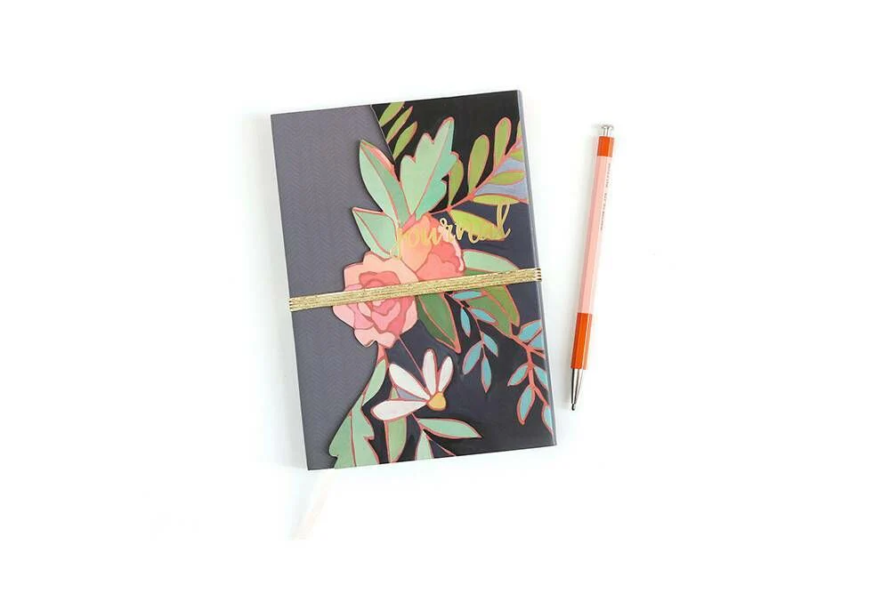 Libreta pequeña con diseño floral y tapas troqueladas con 160 páginas y cierre de goma.