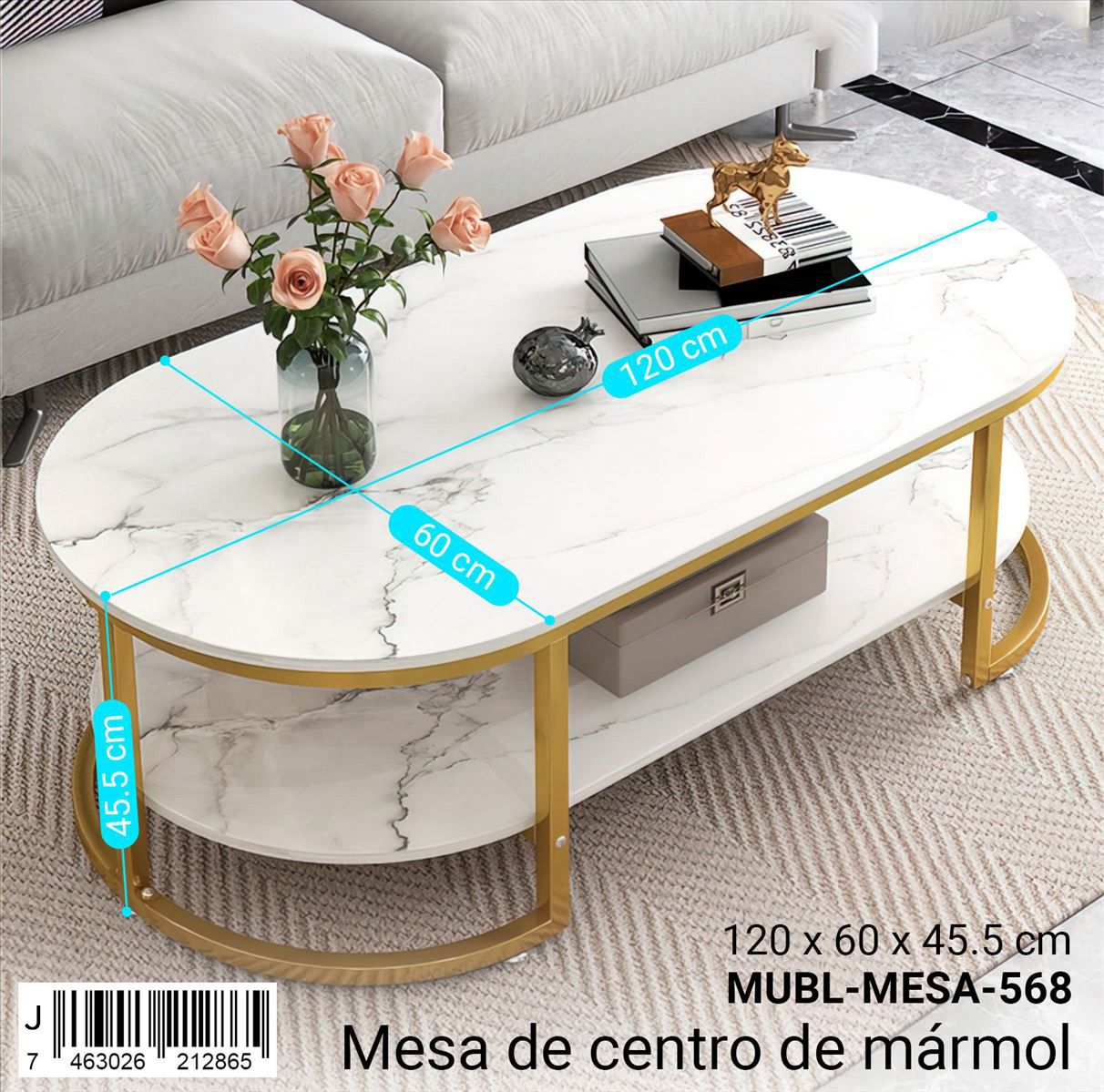 Ideal para dar un toque elegante y funcional a tu sala. Su estructura de metal brinda resistencia, y su superficie tipo mármol combina fácilmente con distintos estilos de decoración. Perfecta para colocar libros, adornos o bebidas.