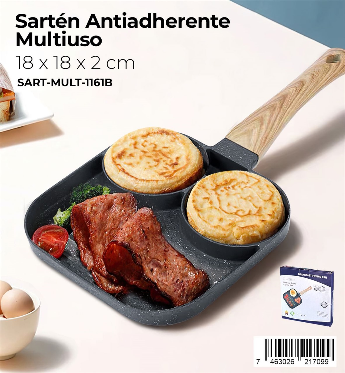 Sartén antiadherente multiuso con tres compartimentos, ideal para preparar varios alimentos a la vez sin mezclar sabores. Cuenta con mango ergonómico con diseño madera, resistente al calor y fácil de limpiar.