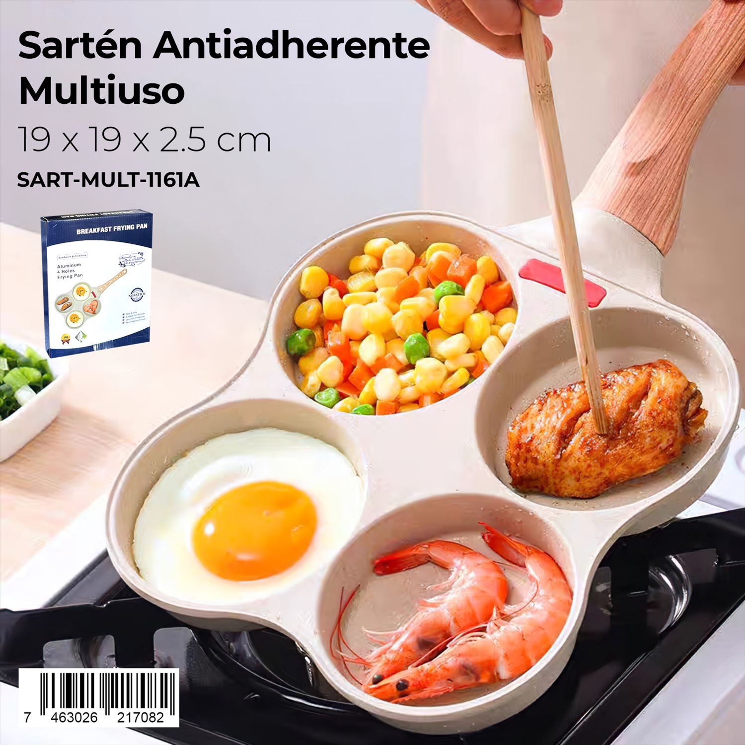 Perfecta para optimizar tu tiempo en la cocina, esta sartén multiuso cuenta con compartimentos que permiten preparar diferentes alimentos de manera simultánea sin que se mezclen los sabores. Su recubrimiento antiadherente facilita la cocción y limpieza, mientras que su diseño compacto y funcional la hace ideal para el día a día.