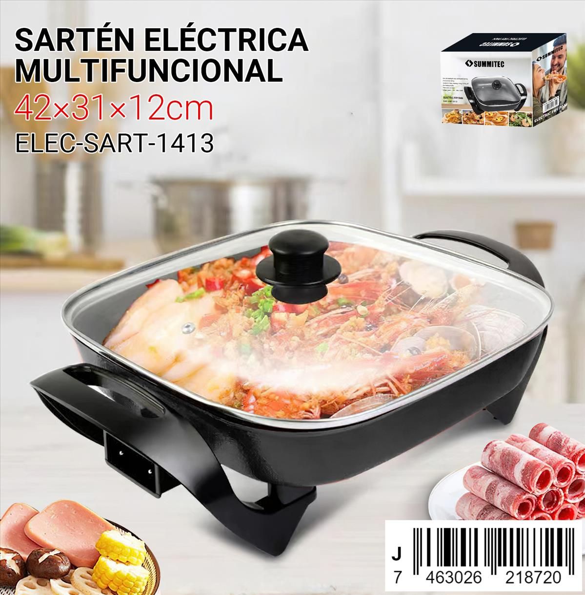 Prepara todo tipo de comidas de forma sencilla con este sartén eléctrico multifuncional Summitec. Gracias a su amplio tamaño y diseño con tapa de vidrio, es perfecto para freír, saltear, hervir o guisar, manteniendo siempre el control de la cocción. Su construcción resistente y su facilidad de uso lo convierten en un aliado indispensable en tu cocina.