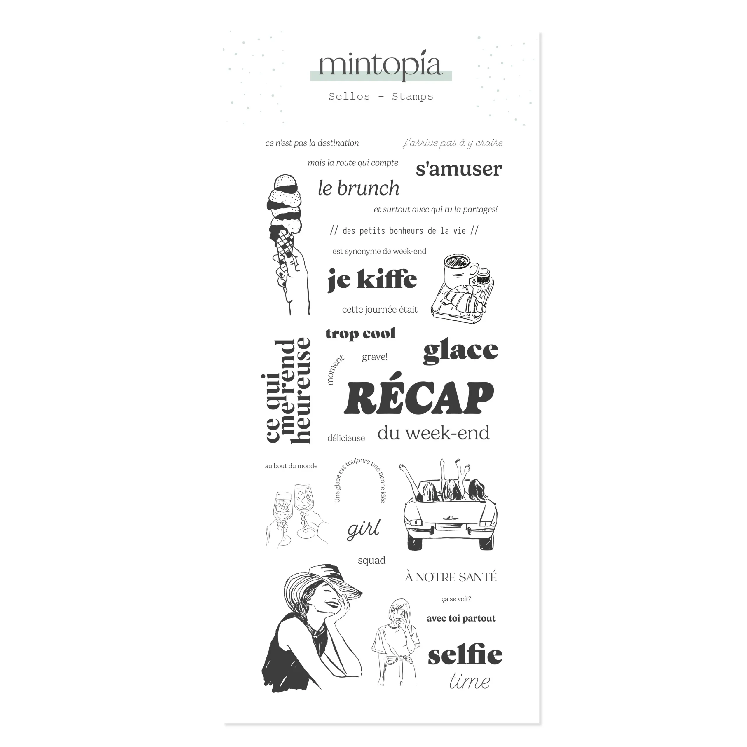 Set de sellos acrílicos de foto polímeros de alta calidad. Diseños compuestos de frases y adornos ideal para documentar un viaje, escapada o días de descanso y desconexión.