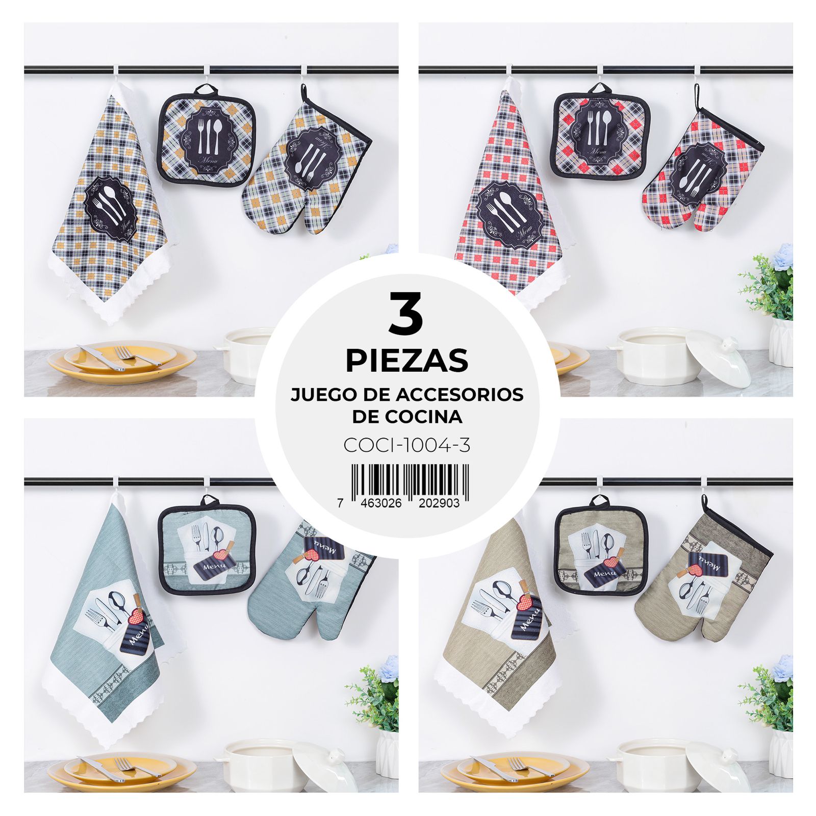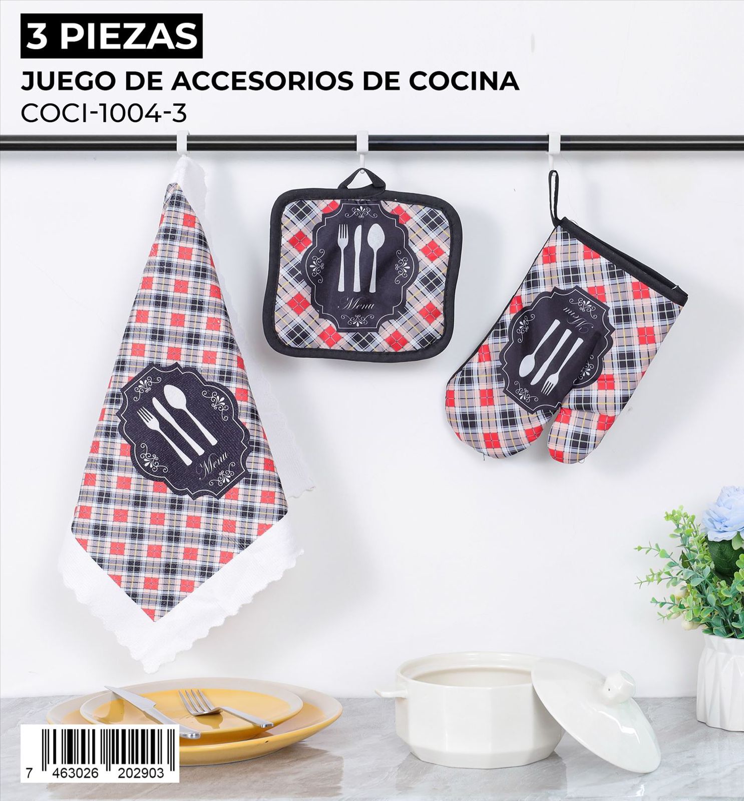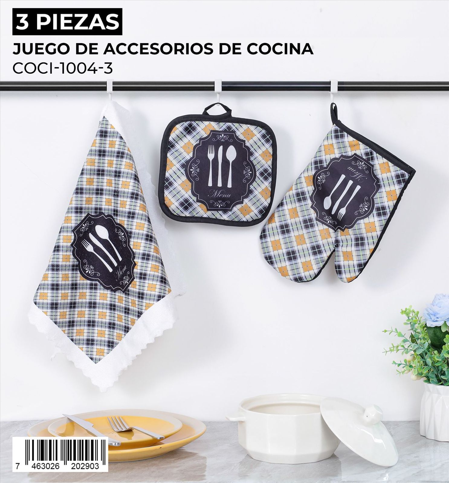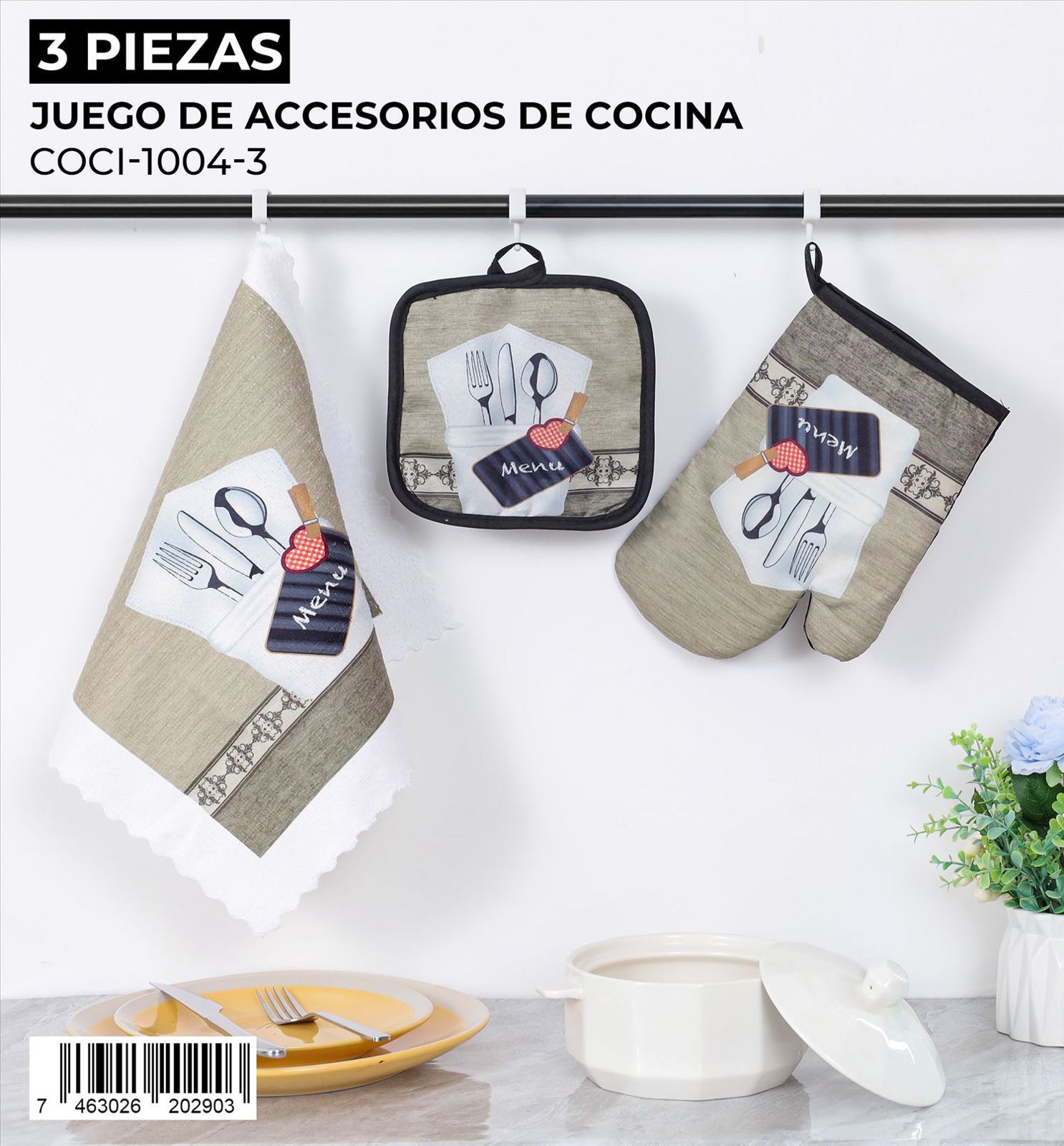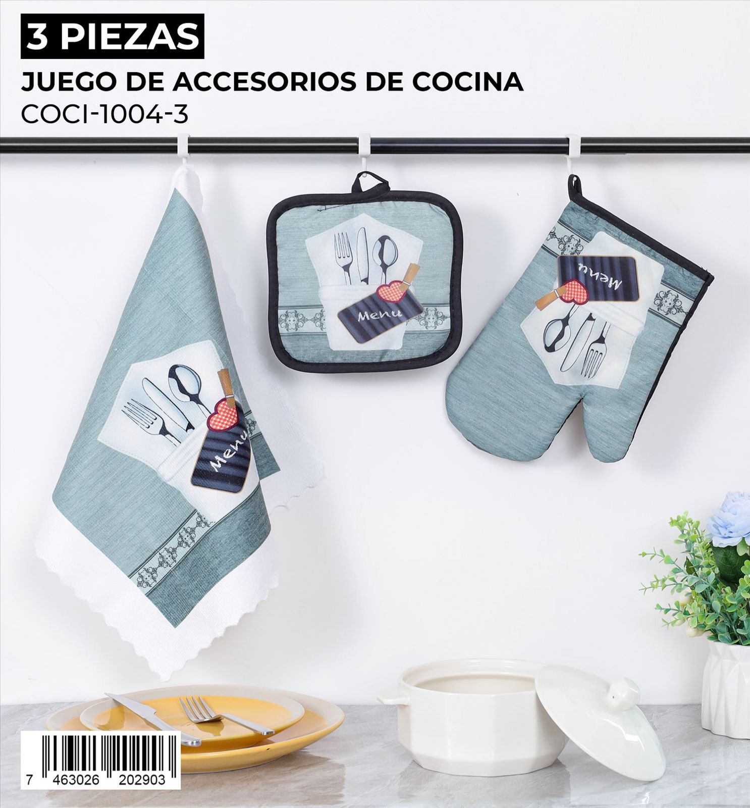 Ideal para equipar tu cocina con estilo y sin complicaciones, este juego de 3 piezas de accesorios de cocina es perfecto para protegerte del calor y mantener la limpieza. Su diseño coordinado añade un toque decorativo a tu espacio.