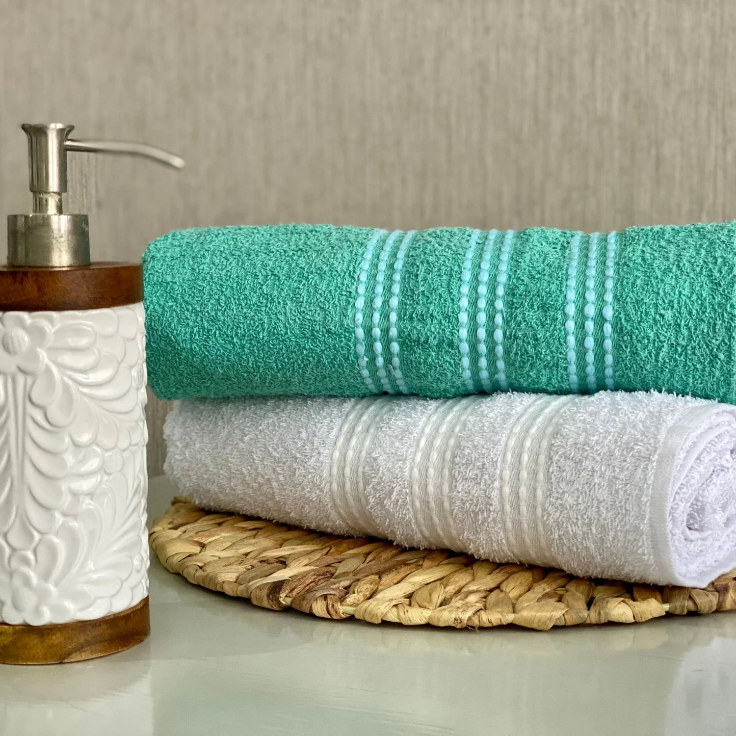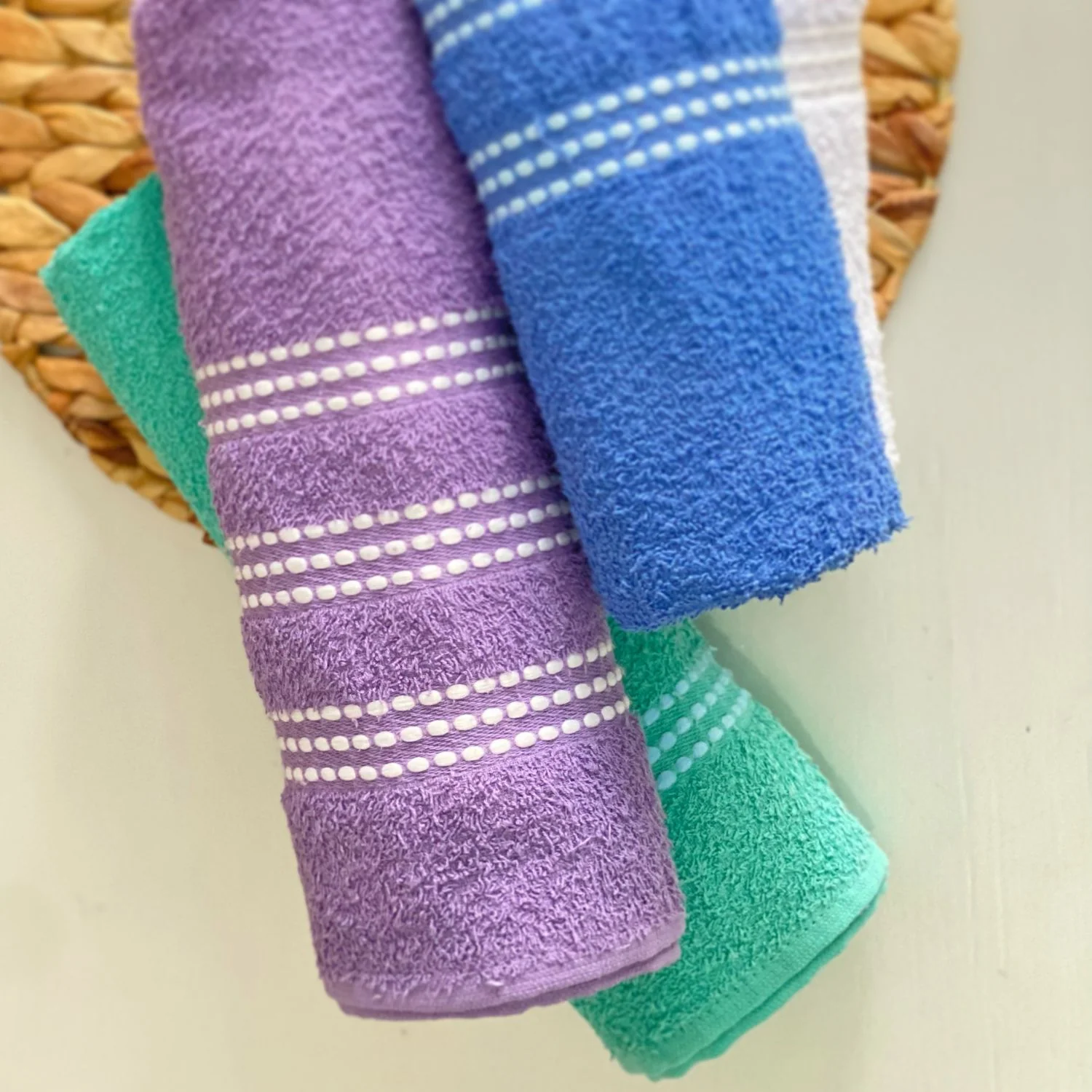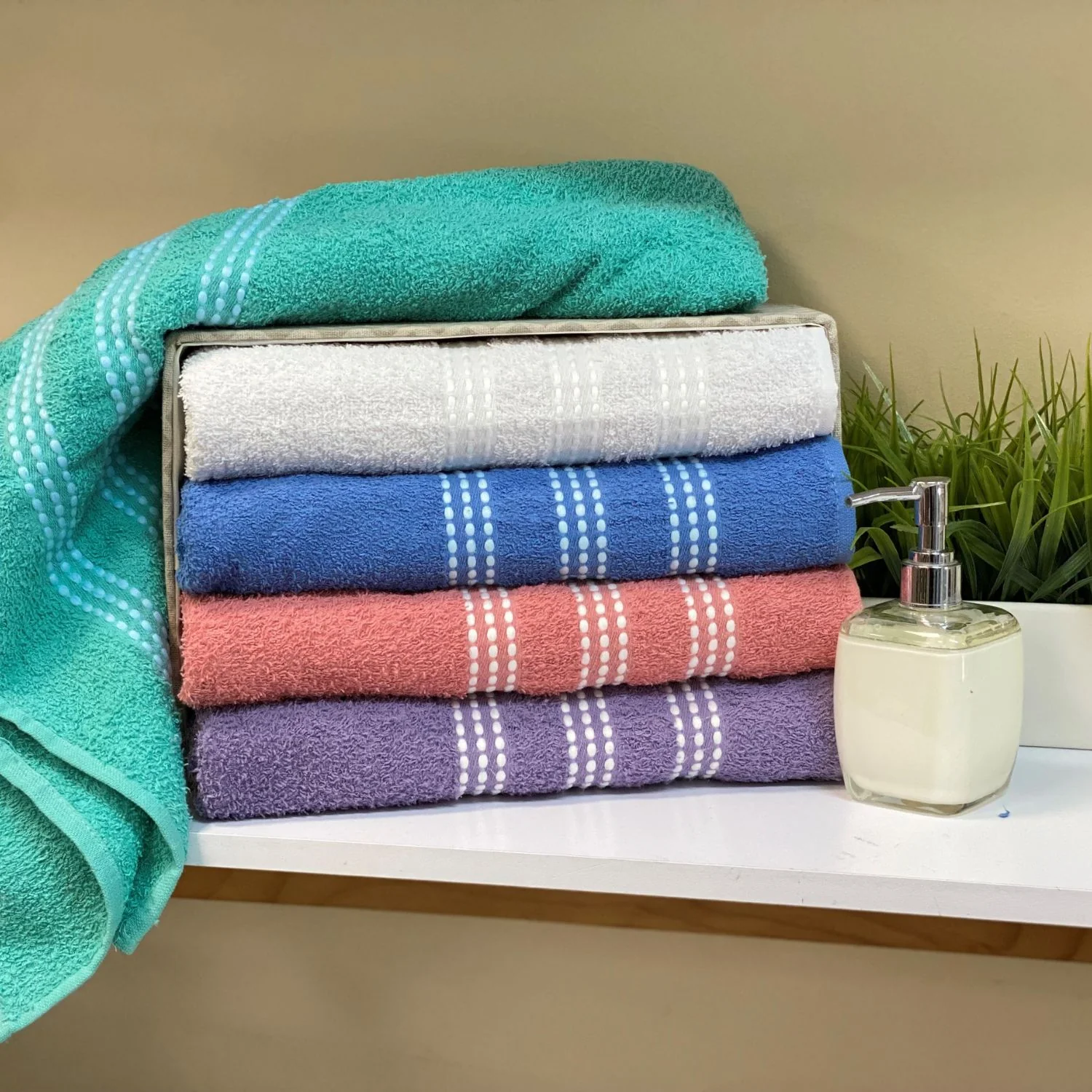 Una toalla que conserva su suavidad y su secado gracias a su composiciònn en algodon y su gramaje de 420 gramos. La colecciòn CLASIC se destaca por su variedad de colores y su cenefa en puntos en la parte inferior. Agregando asì ese toque de elegancia a cada rincon de tu baño.