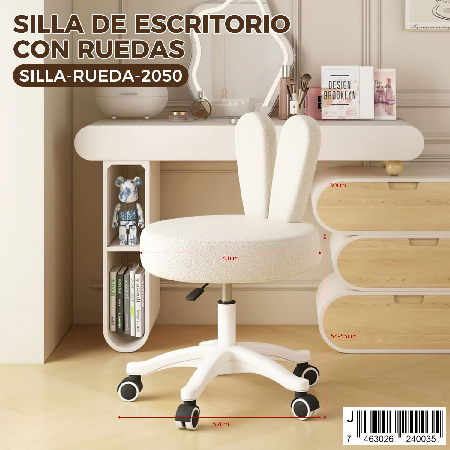 Silla de escritorio con ruedas, tapizada en tela suave color blanco, con respaldo en forma de orejas de conejo para un diseño divertido y original. Ideal para espacios de trabajo o estudio.