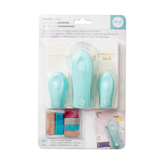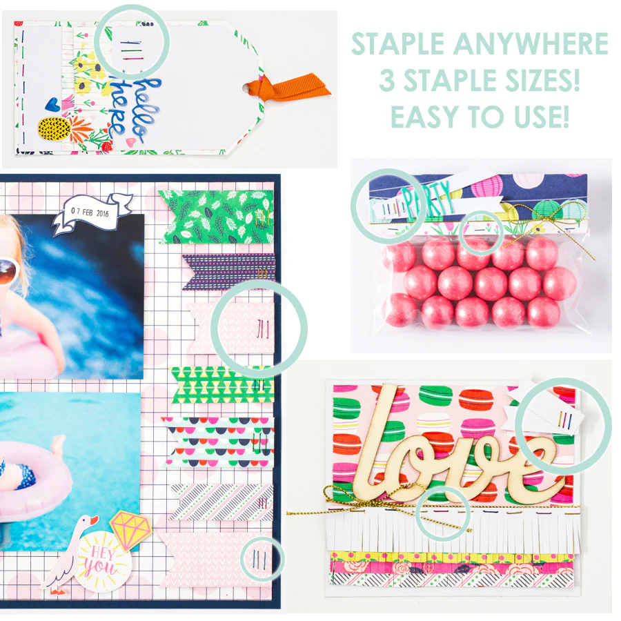Grapadoras tamaño pequeño, mediano y grande, con más de 250 grapas que vienen en tres tamaños y cuatro colores diferentes.